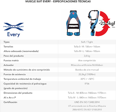 Muscle Suit Every es el primer exoesqueleto del mundo que recibe esta certificación. Es un exoesqueleto innovador y totalmente autónomo, que utiliza músculos artificiales que se activan por presión neumática y no requiere energía externa. El exoesqueleto está diseñado para reducir la carga aplicada a la parte inferior de la espalda (zona lumbar), cuando el usuario mantiene una posición en cuclillas, levanta un objeto pesado, manipula cargas constantemente, etc. Muscle Suit Every ayuda a mejorar los entornos de trabajo y a abordar los trastornos musculoesqueléticos (TME) que se producen durante la manipulación de cargas recurrentes.